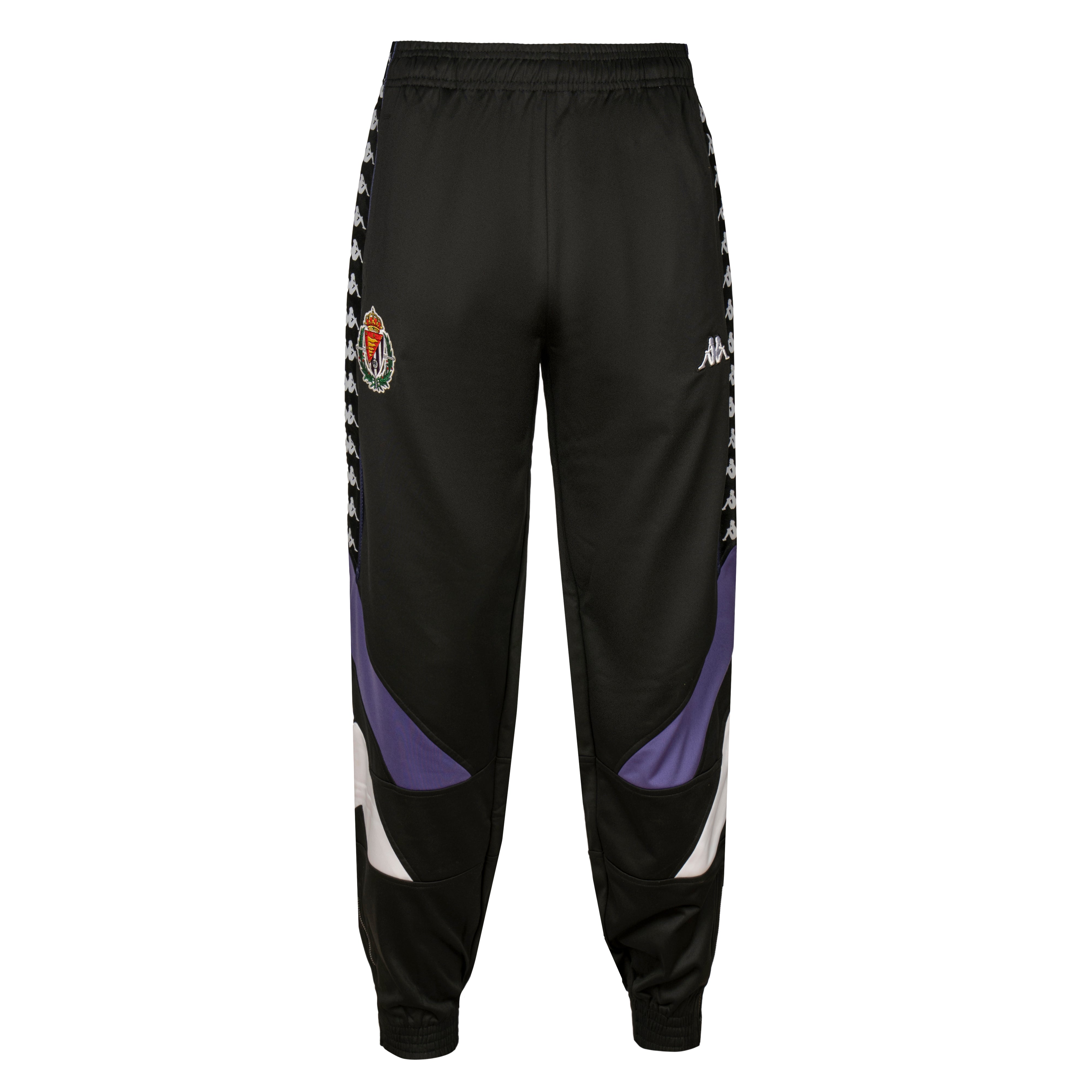 Este pantalón deportivo destaca por su diseño en azul, acompañado de una composición gráfica muy característica en la zona lateral baja: dos bloques diagonales en violeta y blanco que aportan dinamismo y un acabado visual moderno sin recargar la prenda.