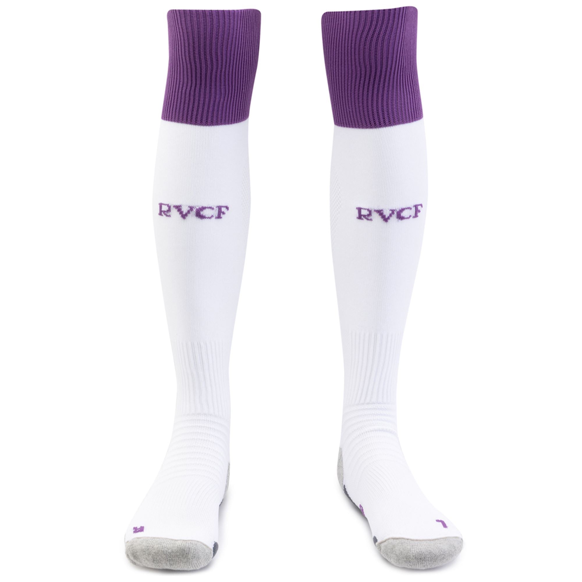 - Inscripción de las iniciales del club: RVCF (Real Valladolid club de fútbol) en la parte delantera, violetas, sobre fondo blanco